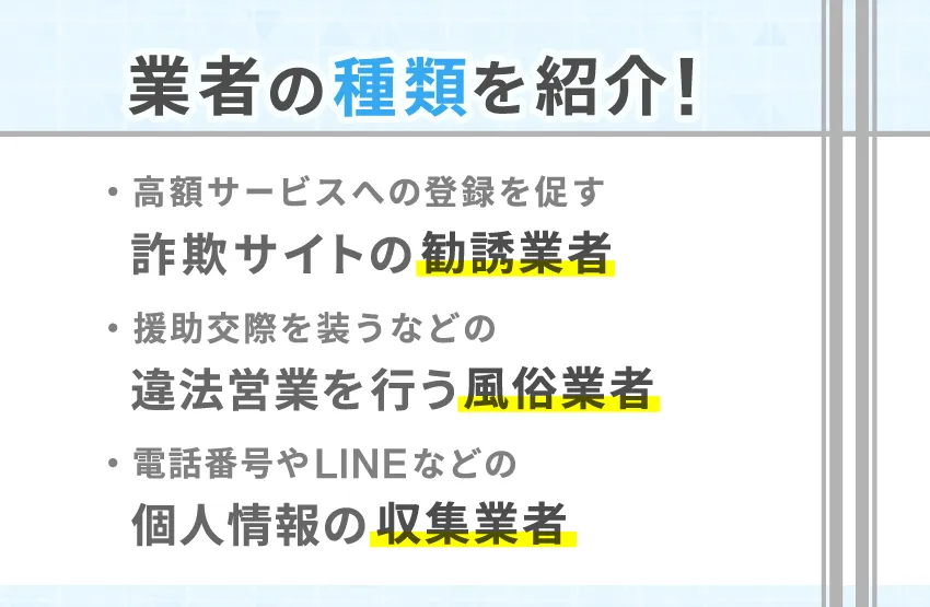 業者とは、運営会社とは関係のない第3者が一般人になりすまし、サイト内の会員を勧誘しようとする人です。