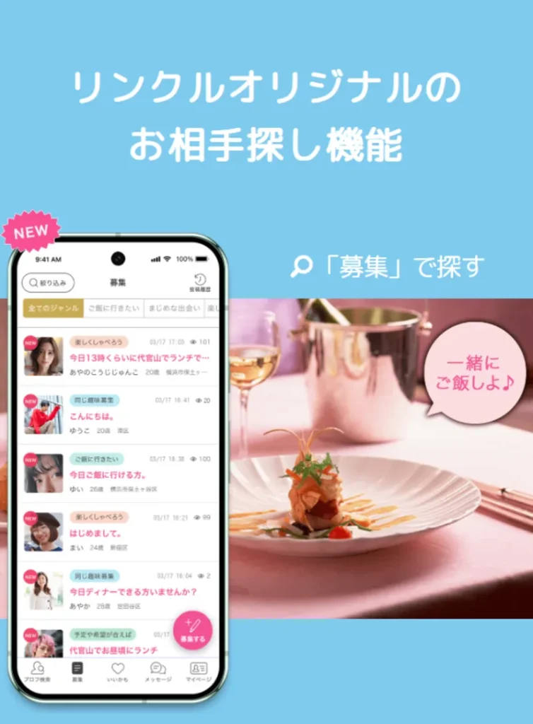 リンクルには「募集」機能があり、女性も自分の目的を明確に表示できます。