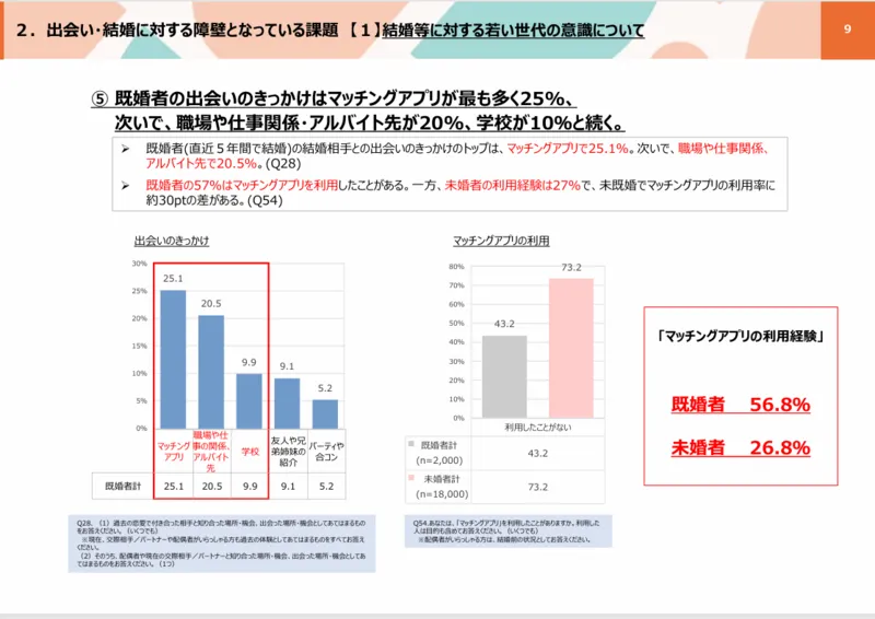 こども家庭庁の2024年調査によると、既婚者の56.8%が、また未婚者でも26.8%がマッチングアプリを使用したことがあると回答しており、もはや現代においてマッチングアプリによる出会いは一般的になってきていると言えます。